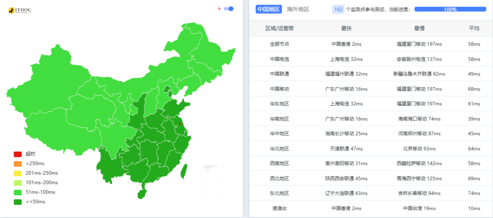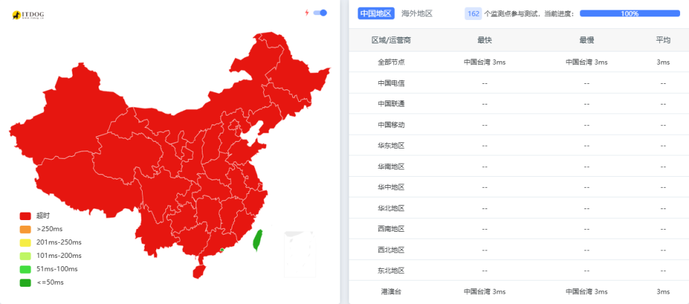 打开ITDOG,分别测试Ping和Tcping输入境外服务器IP,如果境外能通,国内不通,那就是被墙了。