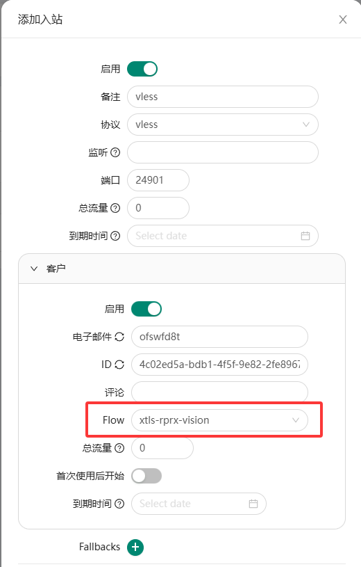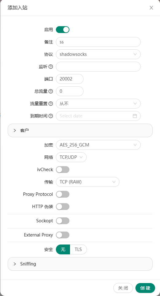 入站列表>添加入站(推荐ss节点),注意端口号要在分配范围内。