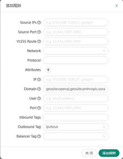 例如分流ChatGPT和Claude,sora.com,为了方便验证我们加入山寨ip检测网址ping0.co