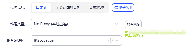 新加一个环境,默认设置即可,代理信息我使用的是本地代理,点击检查网络,确认环境为美国家宽IP